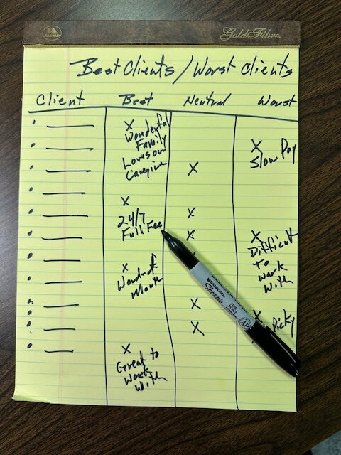 - A more intuitive process using a yellow legal pad to discuss your Best Clients and Worst Clients, and reach consensus on where you will find your Ideal Clients.