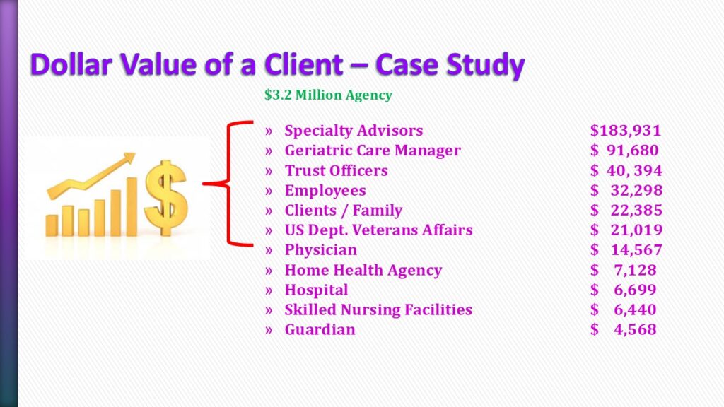 Whenever Sarah is doing one of her public academies, or when she is doing a private academy for a specific client, she invites me to join the group virtually to talk about “Six Secrets to Selling Home Care to Your Ideal Client.” This is a presentation based on 25 years for working with Home Care companies in the top tier of our industry, and seeing how the largest, fastest growing, most profitable companies have clearly identified the clients and the Referral Partners who are the best fit for their business in their local marketplace.